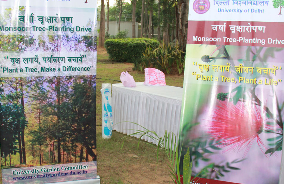 A series of native tree-planting events to enhance and rejuvenate green spaces was launched under patronage of the Vice Chancellor, University of Delhi, on 15th August 2018. At least 2000 saplings of native and established tree species of Delhi (representing 26 taxonomic families) were planted near buildings of the Faculties of Mathematics; Social Sciences; Music; Arts and Sciences. Saplings were gifted to the Garden committee by alumni from Tata Power-DDL Ltd., as well as Government nurseries. Saplings raised by 'malis' of the University garden committee were also used.